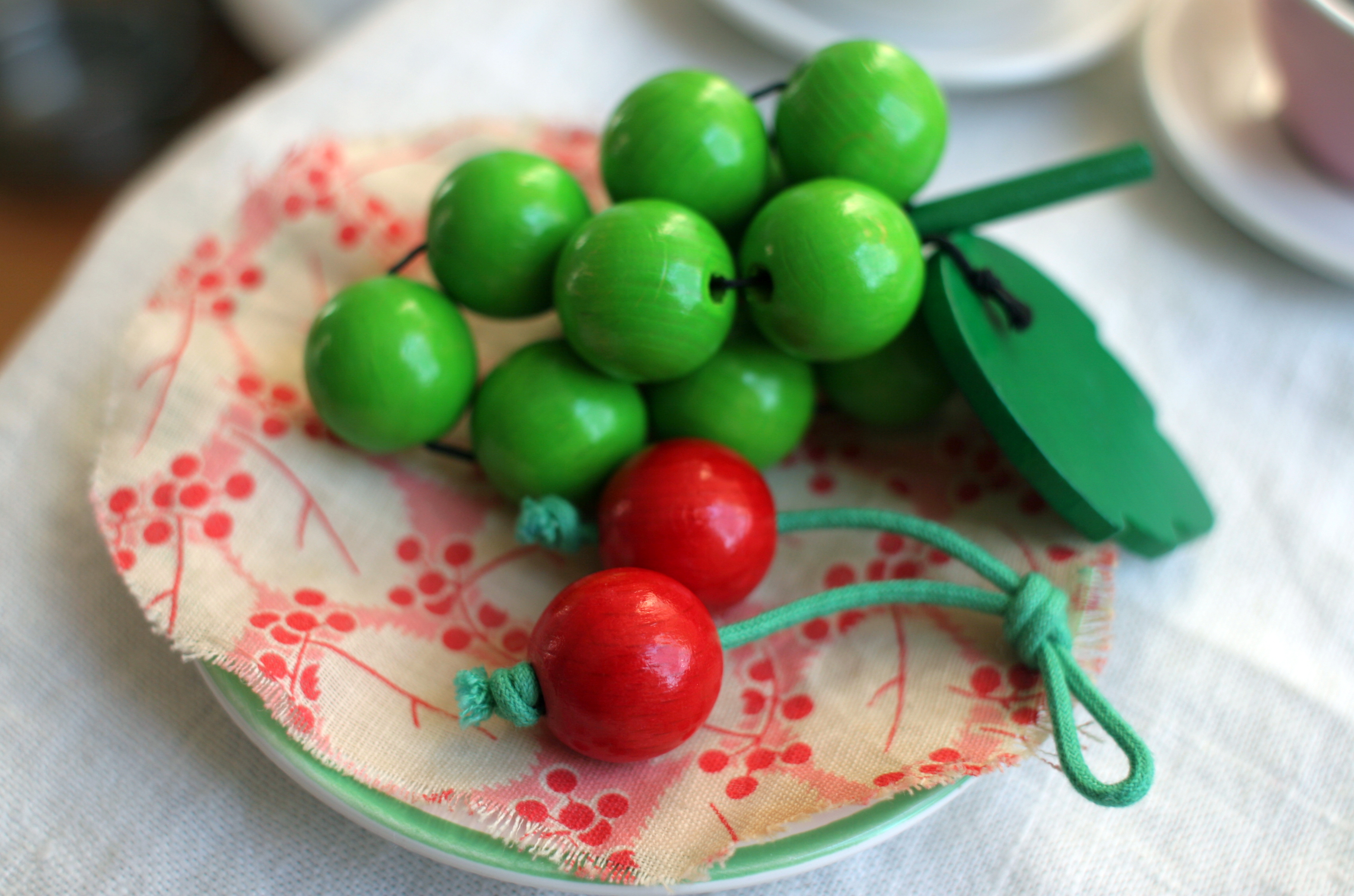 I love these ingenious wooden fruits by Haba. They are a knotted simple string and two wooden beads. I like the idea of making some of our own versions of fruit. I wonder what others we could come up with…