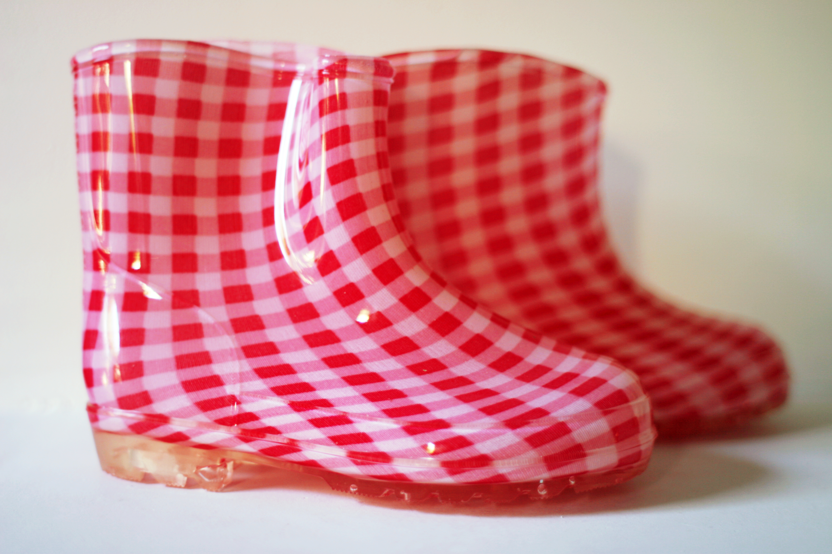Autumn means the rainy season in these parts.  Thus begins the yearly search for the perfect rain boots for the girls.  I found these on Ebay last week.  They are from Korea and were on sale for $10 with free shipping(!)  Korean designs are so cute!  I love this smart use of gingham fabric stretched under the waterproof rubber.  Why didn’t I think of that when I was designing shoes?