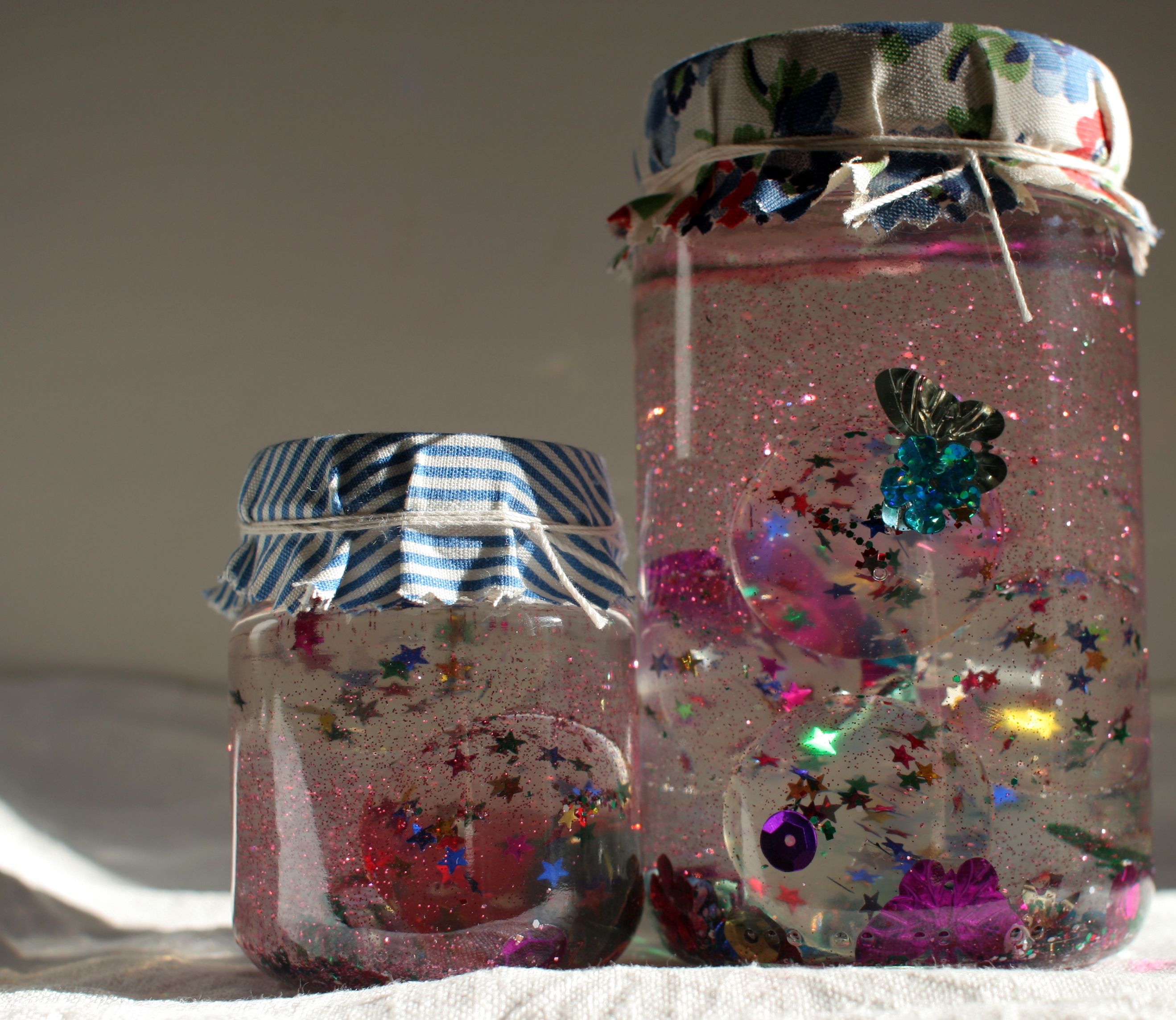 German glass glitter is amazing stuff. It tarnishes as it ages and creates a super-sparkly vintage look. We used silver to make our stars, but the glitter also comes in lots of beautiful colors. German glass glitter is actually made from glass, so you need be careful and wear gloves when you work with it, but the results are worth the extra care. We made these star and moon decorations for a friend’s birthday party. They hung on the edges of a stage and were bright in the candle and stage lights. We took some home for Ada’s room after the party. To make your own Glass Glitter Stars you will need: