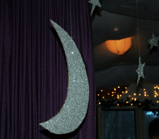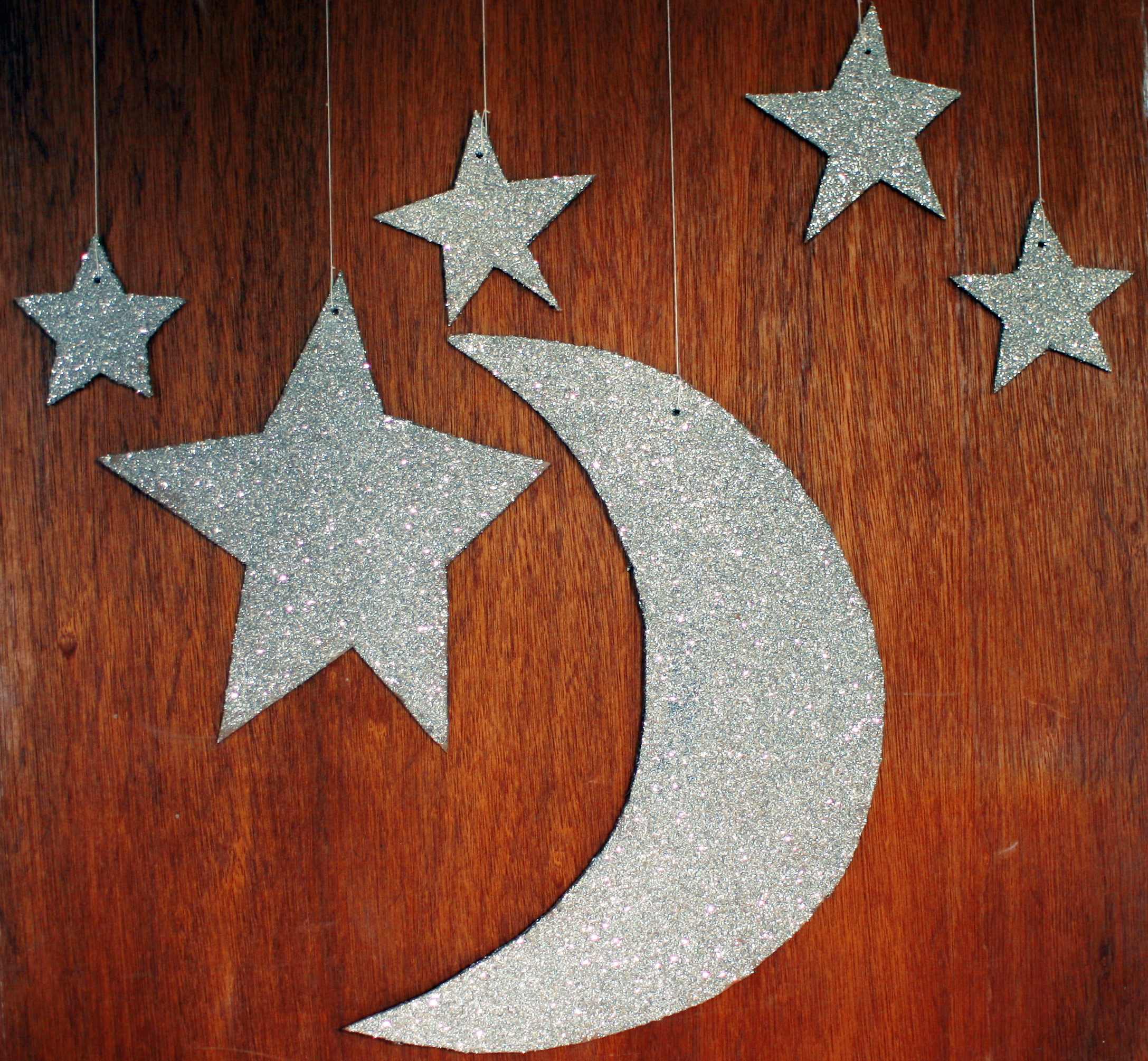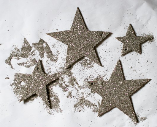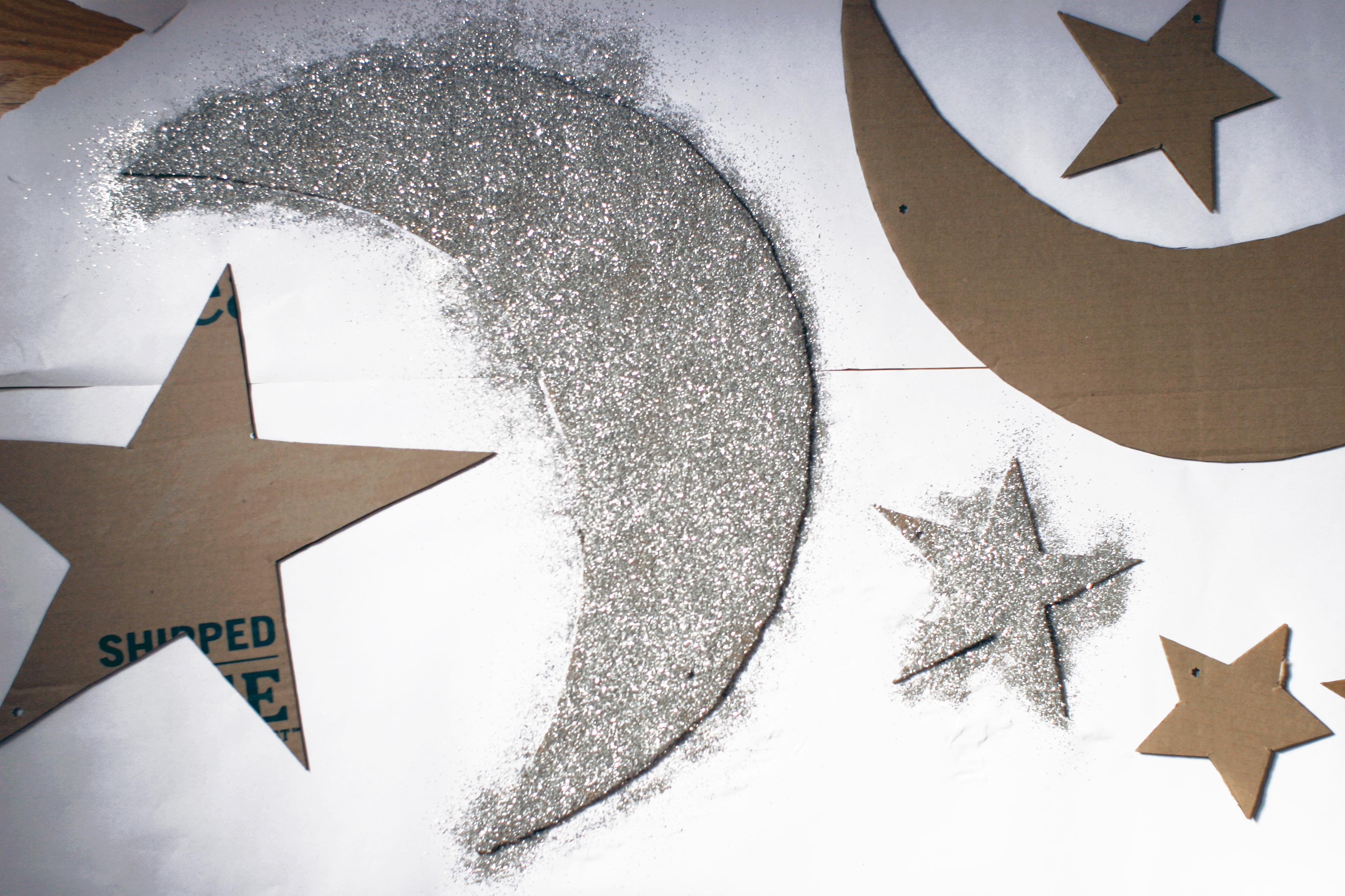 7. Flip stars and moon over and repeat glue and glitter process. (Don’t forget to leave your hole clear for hanging).