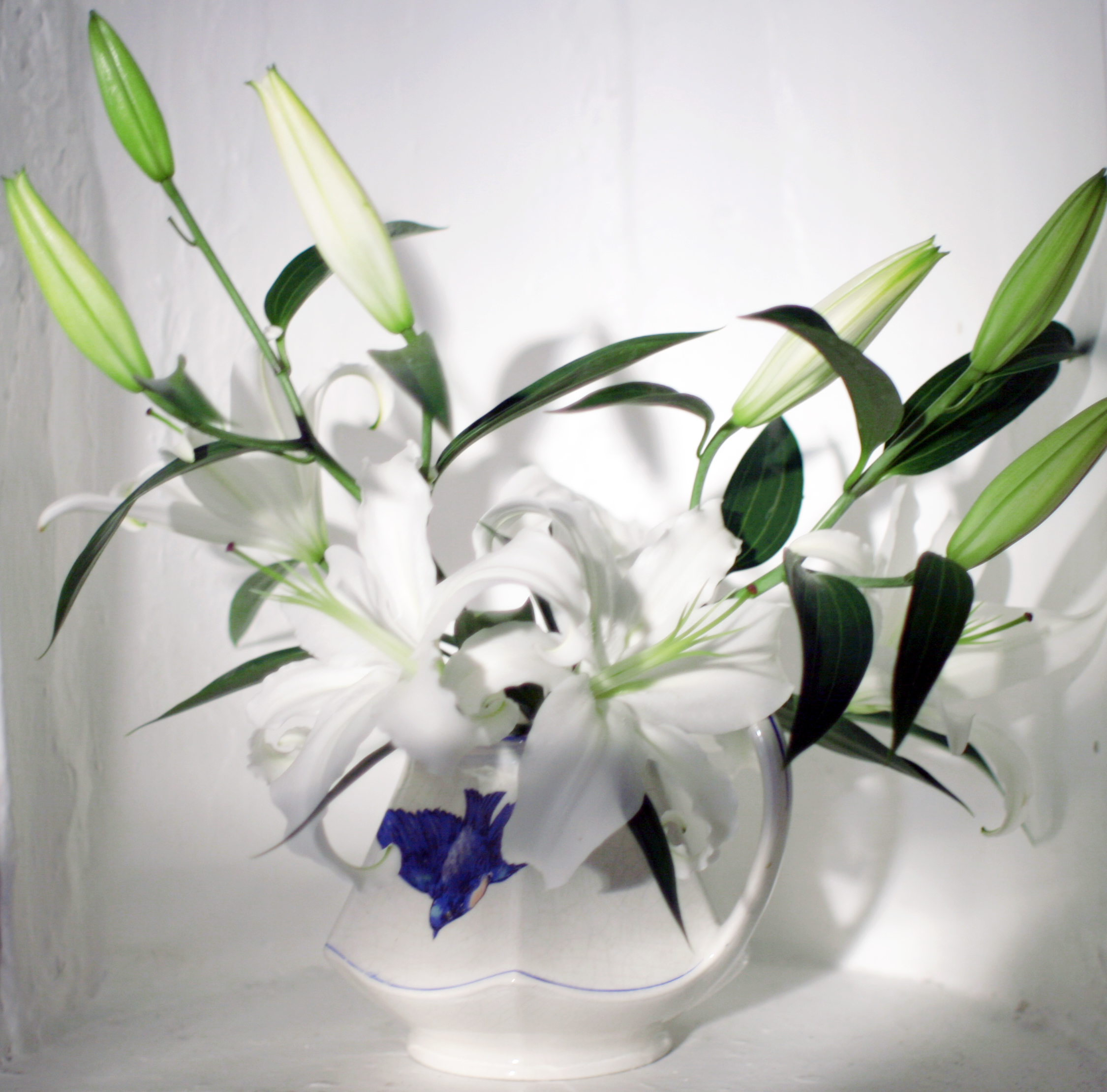 Flowers1Flowers2Fresh flowers make everything better, in my opinion.  These Casa Blanca lilies are one of my favorites.  Casa Blancas are fragrant and will last for more than a week.  We get ours for $5 a stem around here.  I like to buy lilies when their buds are closed and watch them open a little more each day.  Each Casa Blanca stem is so full of flowers that we often cut off singles to put in small vases for the bathrooms.  Our Bluebird of Happiness pitcher was an $8 flea market find.  To make your lilies last longer: