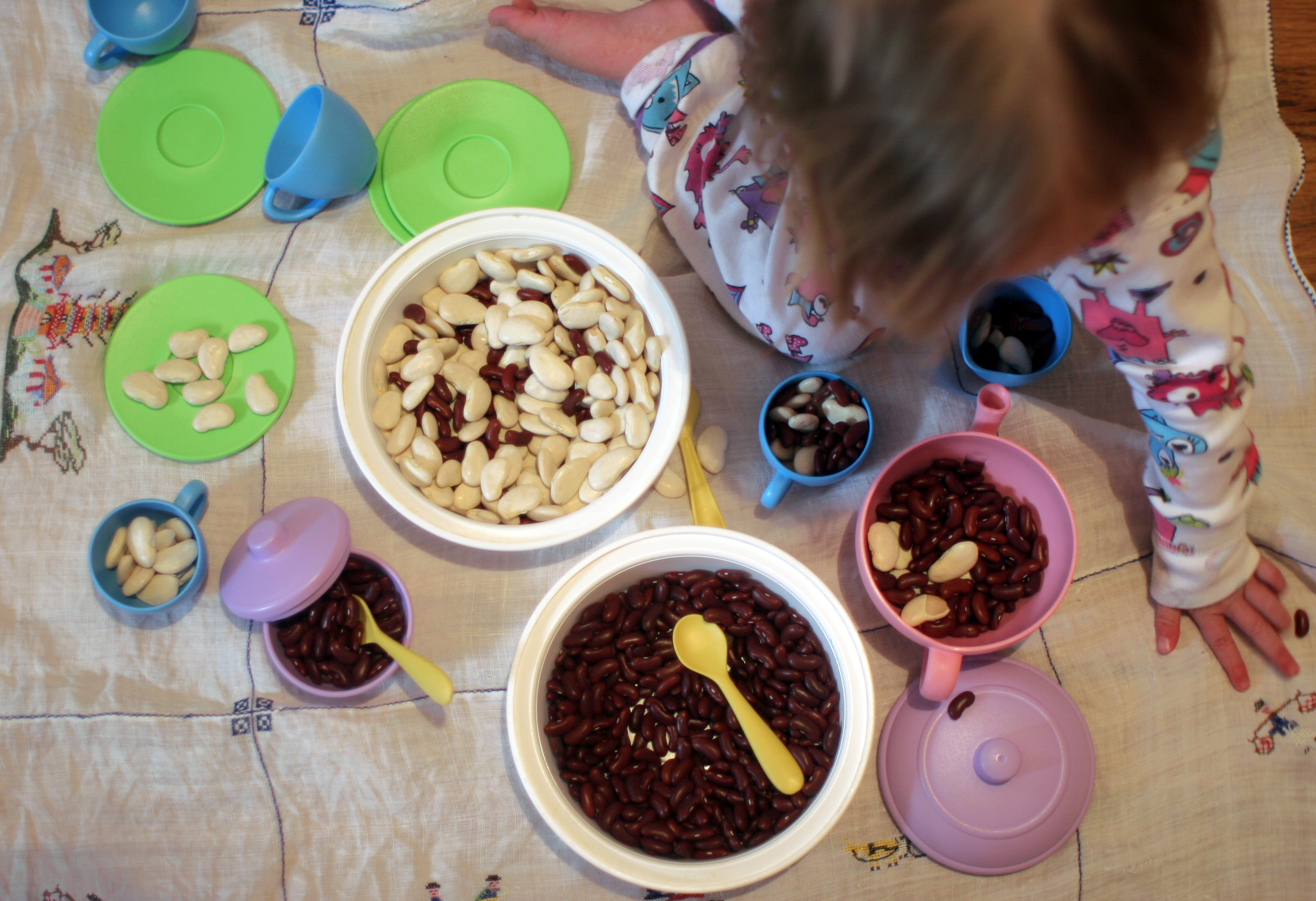 dried beans, dried beans toys, empty bowls, Green Toys, Green Toys tea set, inexpensive kids toys, play kitchen, recycled plastic tea set, toddler games, toddler toys