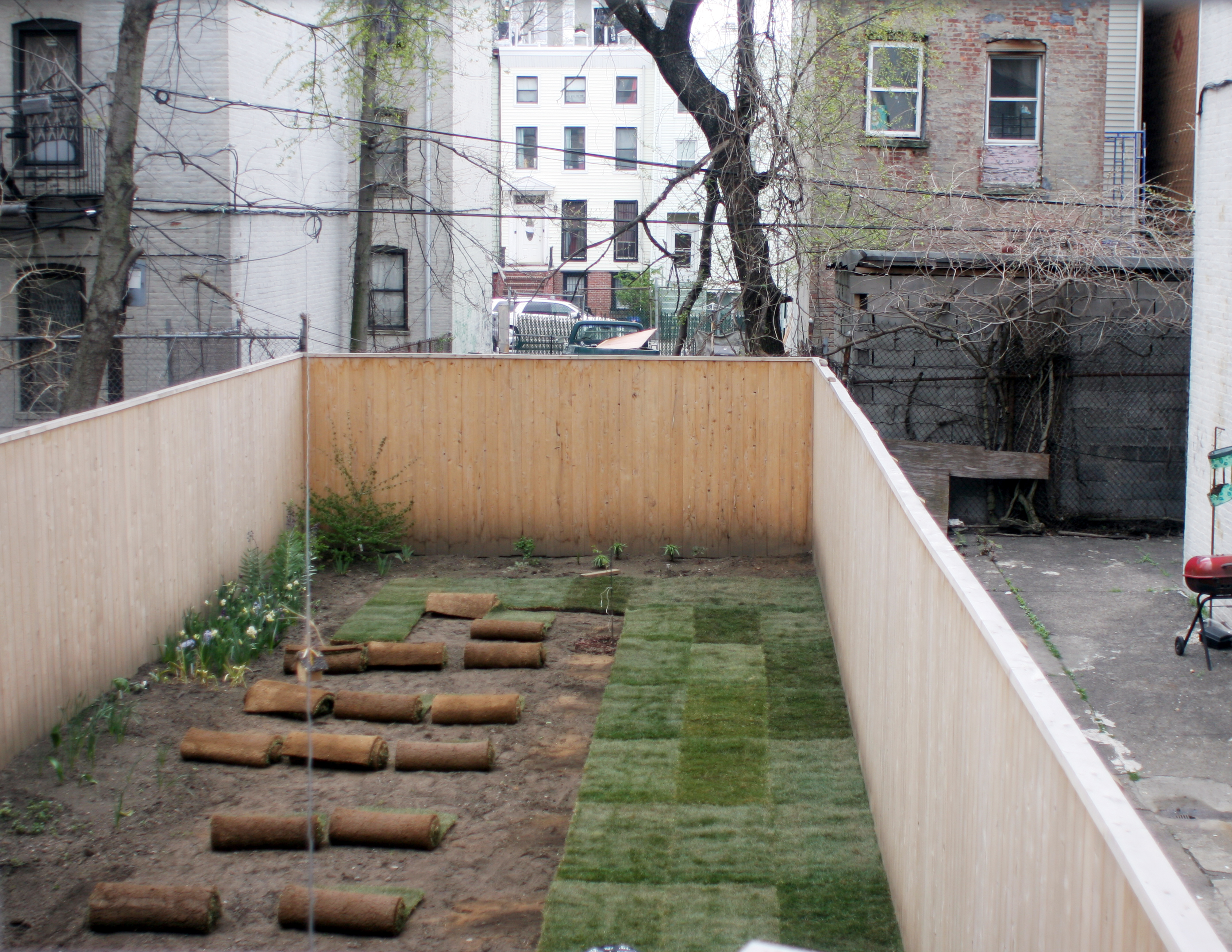 9. After much deliberation, we decide to hire a company to lay sod down in the back instead of doing it ourselves. We initially had trouble finding a company that would work with such a small yard, but finally ended up using Kings County Nursery in Brooklyn. They were right down the road from us and showed up a super-quick 30 minutes after I called for an estimate. They were very reasonable and did the job in under two hours. We opted out of using the standard pest control and root stimulators (both chemical) for the sod. Although our soil looked rich, we are trying to amend it after years of mistreatment and did not want to add any other chemicals to the yard. The pesticide that sod companies use to control grubs is usually Sevin. Sevin is known to be dangerous to both children and native insects such as honeybees. Although the nursery assured us that Sevin would only be used under the sod, we did not feel comfortable adding it to our back yard. We felt confident that the birds that make daily visits to our back yard, the earthworms in the soil and the rich brown dirt back there would make the sod happy without adding chemicals.