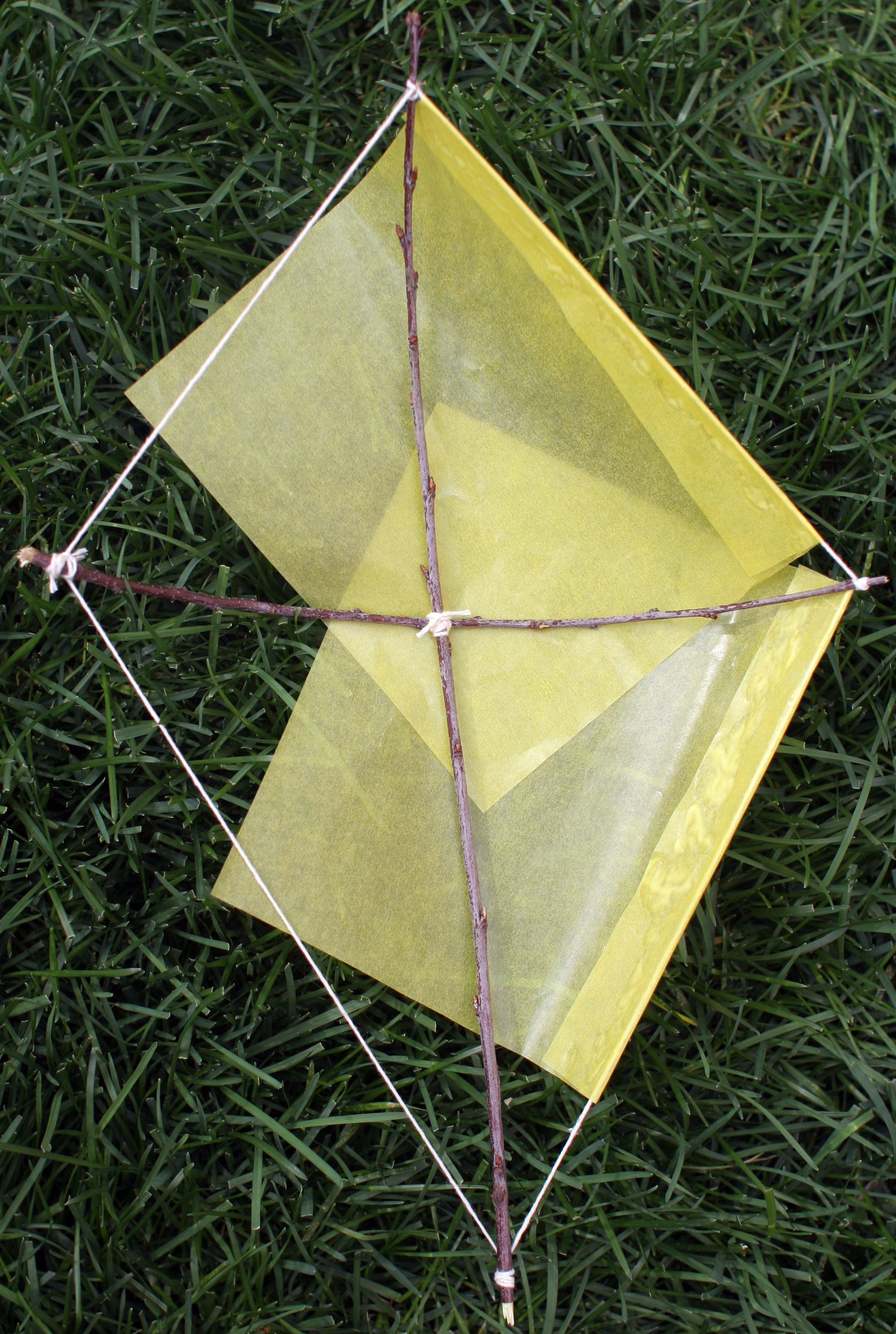 3. Cut, wrap and glue kite paper around diamond shaped frame. We glued our seams shut as well. Be sure to wrap edges and secure around the string at the edges. (Larger paper and less glue would make the kites lighter).