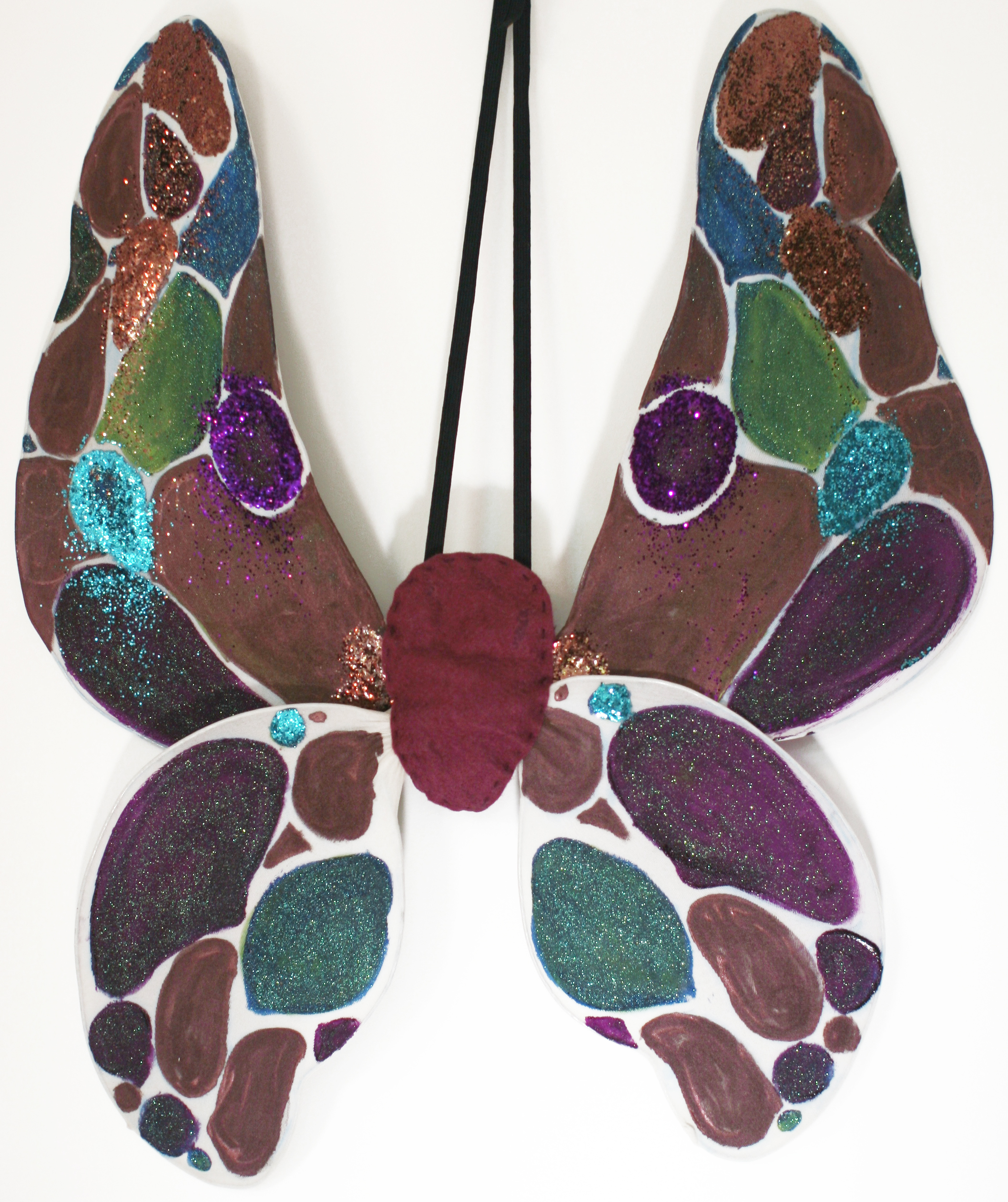 11. Fill in traced shapes with paint. Add glue and glitter as you like. This part is fun! Our black wings had a Velvet Elvis sort of feeling and the acrylic paints create a dusty wing-like finish on top of the pantyhose.