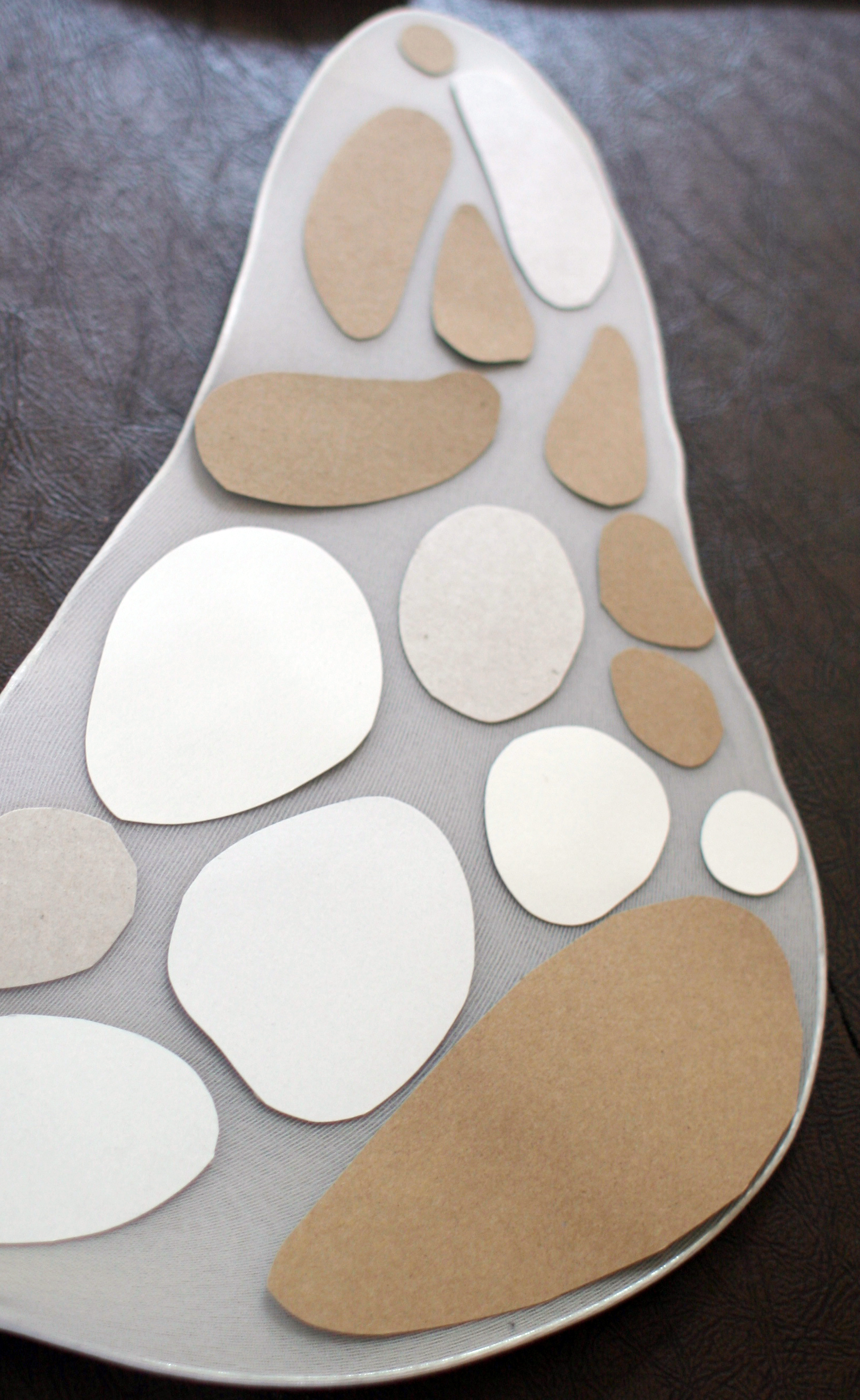 9. Cut out cardboard shapes, (we used scraps from the pantyhose packaging). Lay pieces on one wing, trace with chalk and flip cardboard over to create a mirror image on second wing. Chalk can be brushed off or painted over later.