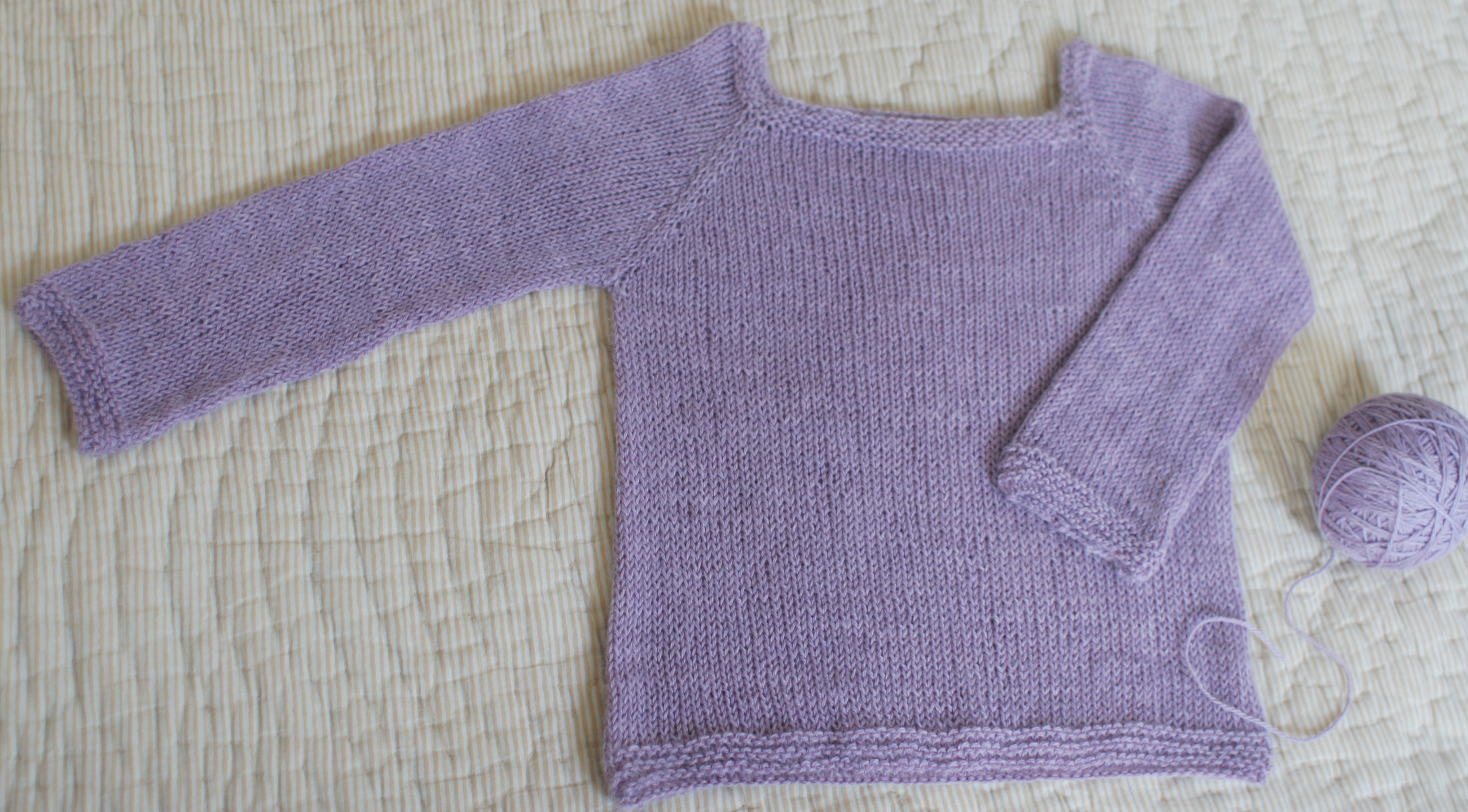 I swear this yarn looked more grey in the yarn shop. I am sure this baby is a girl, but we din’t find out the sex, so not really really sure. I suppose he won’t mind a lilac sweater. The pattern is the Sock Yarn Sweater by Knitbot and it knits up quite quickly, (even more quickly if you aren’t chasing around two little girls I am sure). The yarn is soft organic merino from Swans Island in Maine. This line of yarn uses all natural dyes and their colors are subtle and calm. This sweater, knitted up in size 6-12 months, took half a skein of this Swans Island fingering weight: 100 grams/525 yds per skein. I used Clover bamboo size 4 needles. (Their needles make projects even more fun to work on). I seemed to have saved fewer baby clothes than I remembered, so I need to get to work on the other two patterns in my knitting bag before the little one arrives.