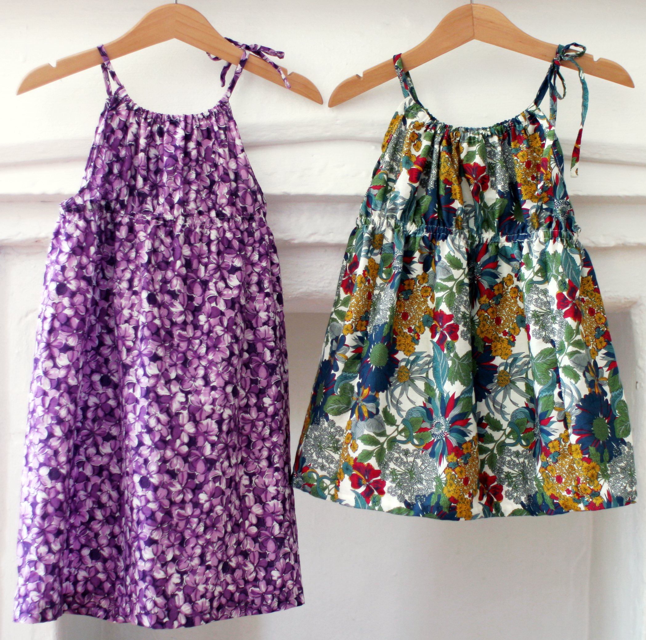 Here are our finished Fairy costumes for Halloween. The wing construction how-to is posted here. Initially I was going to sew costumes out of tulle, like some of the vintage ballet costumes on our Pinterest board. But after some experimenting I realized altering some of our existing dress-up clothes would work better. These two dresses are old shirts. I altered and added shorter straps to the green dress and made slits up the sides of the gold dress to allow a tulle skirt to fit underneath. We used this tutorial from wikiHow to make a simple no-sew tulle skirt similar to this one: